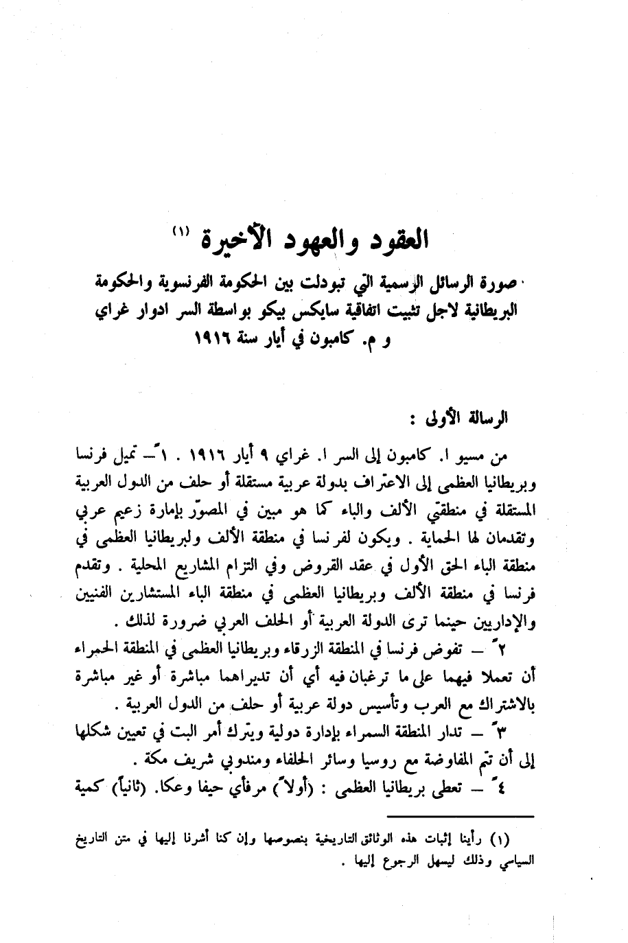 صورة الرسائل الرسمية التي تبودلت بين الحكومة الفرنسوية والحكومة البريطانية لأجل تثبيت اتفاقية سايكس بيكو بواسطة السر ادوار غراي وم. كامبون في أيار سنة 1916