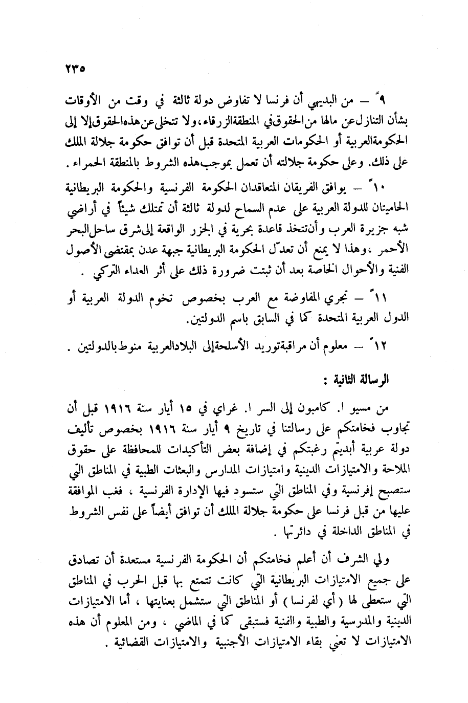 من مسيوا. كامبون إلى السرا. غراي في 15 أيار سنة 1916 قبل أن تجاوب فخامتكم على رسالتنا في تاريخ 9 أيار سنة 1916 بخصوص تأليف دولة عربية أبديتم رغبتكم في إضافة بعض التأكيدات للمحافظة على حقوق الملاحة والامتيازات الدينية وامتيازات المدارس والبعثات الطبية في المناطق التي ستصبح فرنسية وفي المناطق التي ستسود فيها الإدارة الفرنسية، فغب الموافقة عليها من قبل فرنسا على حكومة جلالة الملك أن توافق أيضاً على نفس الشروط في المناطق الداخلة في دائرتها.