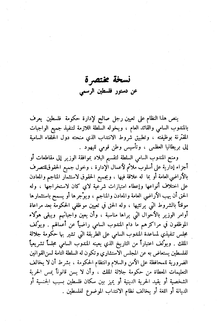 لمساعدة المندوب السامي على الطريقة التي تشير بها حكومة جلالة الملك. ويؤلف اعتباراً من التاريخ الذي يعينه المندوب السامي مجلساً تشريعياً لفلسطين يستعاض به عن المجلس الاستشاري وتكون له السلطة التامة لسن القوانين الضرورية للمحافظة على الأمن والسلام وانتظام الحكومة، بشرط أن لا يخالف التعليمات المعطاة من حكومة جلالة الملك، وأن لا يسن قانوناً يمس الحرية الشخصية أو يقيد الحرية الدينية أو يميز بين سكان فلسطين بسبب الجنسية أو الديانة أو اللغة أو يخالف نظام الانتداب الموضوع لفلسطين.