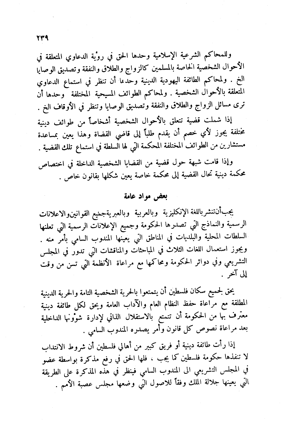 يحق لجميع سكان فلسطين أن يتمتعوا بالحرية الشخصية التامة والحرية الدينية المطلقة مع مراعاة حفظ النظام العام والآداب العامة ويحق لكل طائفة دينية معترف بها من الحكومة أن تتمتع بالاستقلال الذاتي لإدارة شؤونها الداخلية بعد مراعاة نصوص كل قانون وأمر يصدره المندوب السامي.
