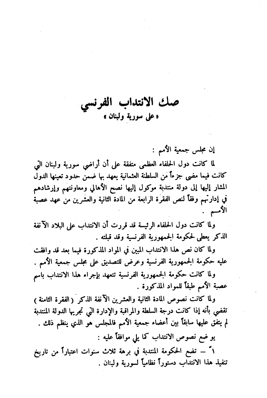 ولما كان نص هذا الانتداب المبين في الماد الذكورة فيما بعد قد وافقت عليه حكومة الجمهورية الفرنسية وعرض للتصديق على مجلس جمعية الأمم.