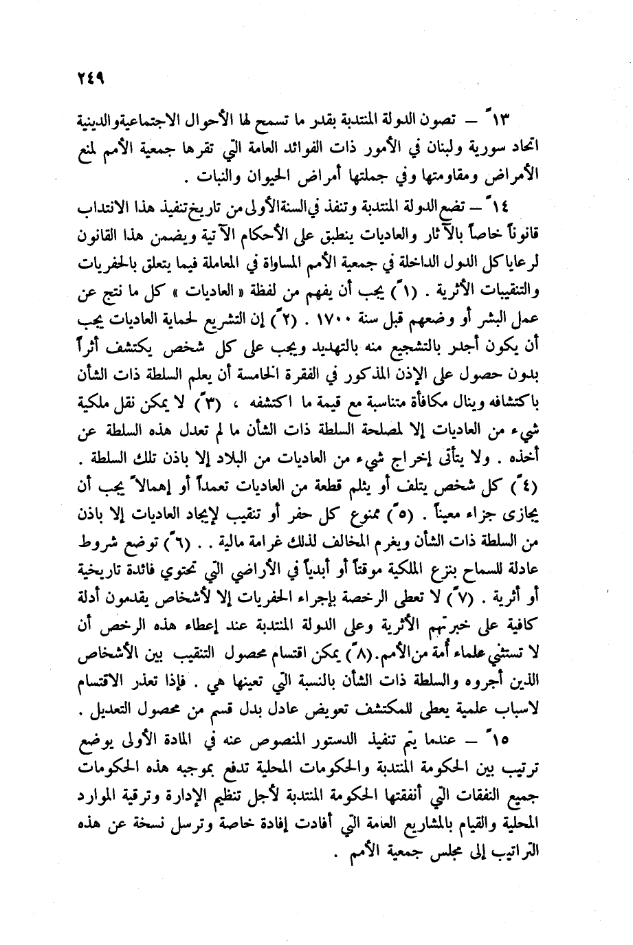 13 - تصون الدولة المنتدبة بقدر ما تسمح لها الأحوال الاجتماعية والدينية اتحاد سورية ولبنان في الأمور ذات الفوائد العامة التي تقرها جمعية الأمم لمنع الأمراض ومقاومتها وفي جملتها أمراض الحيوان والنبات.