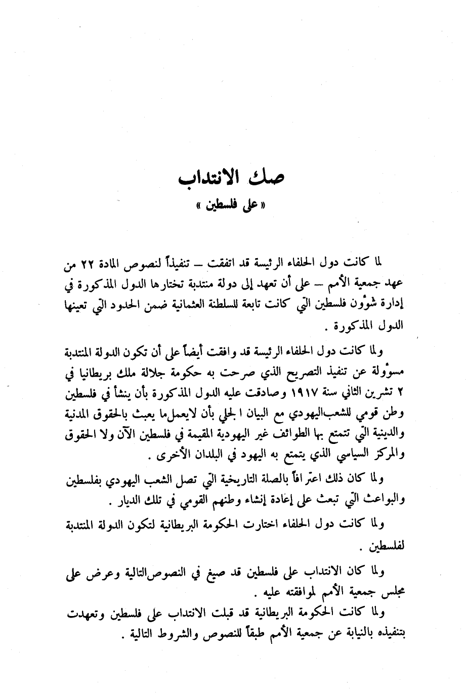 لما كانت دول الحلفاء الرئيسة قد اتفقت تنفيذاً لنصوص المادة 22 من عهد جمعية الأمم على أن تعهد إلى دولة منتدبة تختارها الدول المذكورة في إدارة شؤون فلسطين التي كانت تابعة للسلطنة العثمانية ضمن الحدود التي تعينها الدول المذكورة.