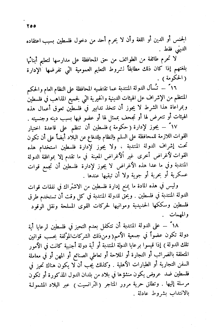 وبمراعاة هذا الشرط لا يجوز أن تتخذ تدابير في فلسطين تعوق أعمال هذه الهيئات أو تتعرض لها أو تجحف بممثل لها أو عضو فيها بسبب دينه وجنسيته.