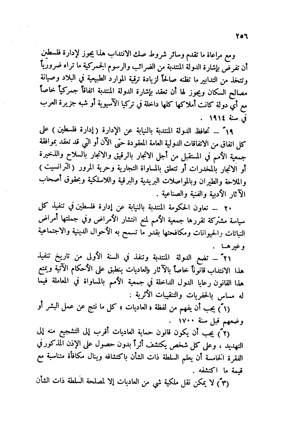 21 - تضع الدولة المنتدبة وتنفذ في السنة الأولى من تاريخ تنفيذ هذا الانتداب قانوناً خاصاً بالآثار والعاديات ينطبق على الأحكام الآتية ويمتع هذا القانون رعايا الدول الداخلة في جمعية الأمم بالمساواة في المعاملة فيما له مساس بالحفريات والتنقيبات الأثرية: