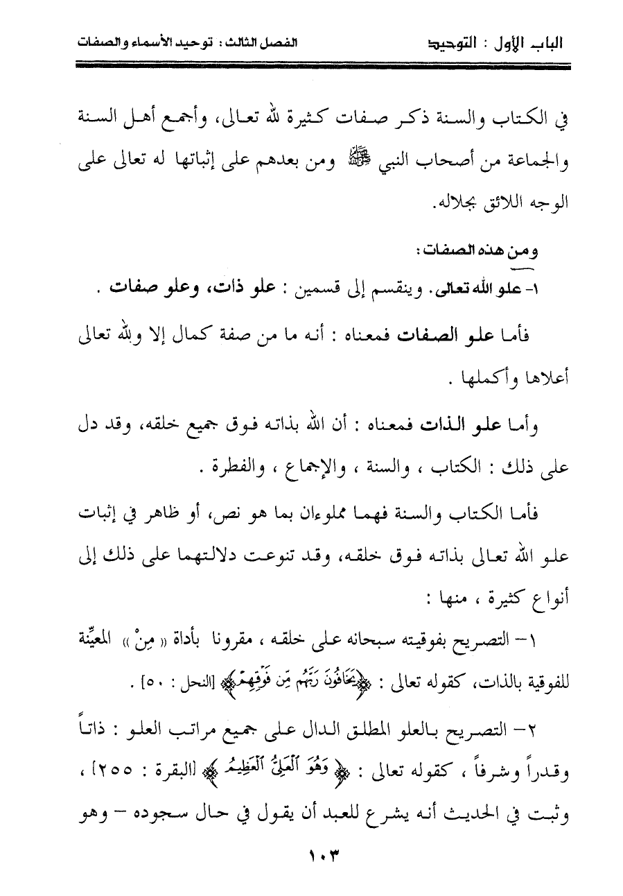 فأما علو الصفات فمعناه: أنه ما من صفة كمال إلا ولله تعالى أعلاها وأكملها.