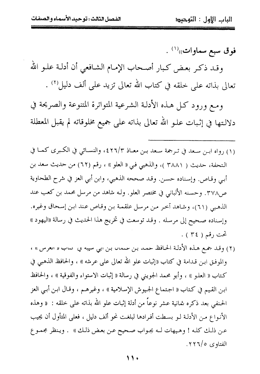 وقد ذكر بعض كبار أصحاب الإمام الشافعي أن أدلة علو الله تعالى بذاته على خلقه في كتاب الله تعالى تزيد على ألف دليل"٢".