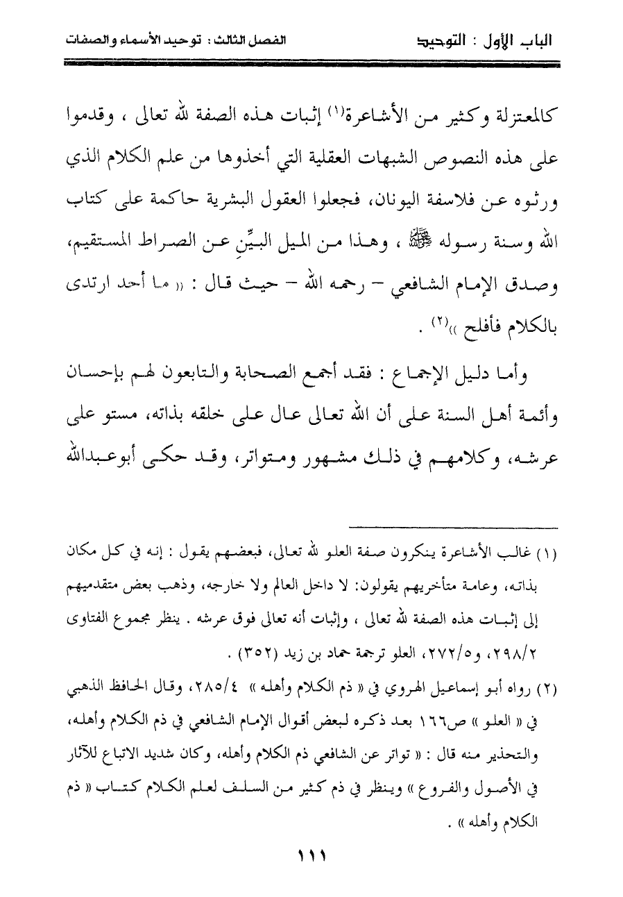 كالمعتزلة وكثير من الأشاعرة"١" إثبات هذه الصفة لله تعالى، وقدموا على هذه النصوص الشبهات العقلية التي أخذوها من علم الكلام الذي ورثوه عن فلاسفة اليونان، فجعلوا العقول البشرية حاكمة على كتاب الله وسنة رسوله صلى الله عليه وسلم، وهذا من الميل البيِّنِ عن الصراط المستقيم، وصدق الإمام الشافعي - رحمه الله - حيث قال: "ما أحد ارتدى بالكلام فأفلح" "٢".