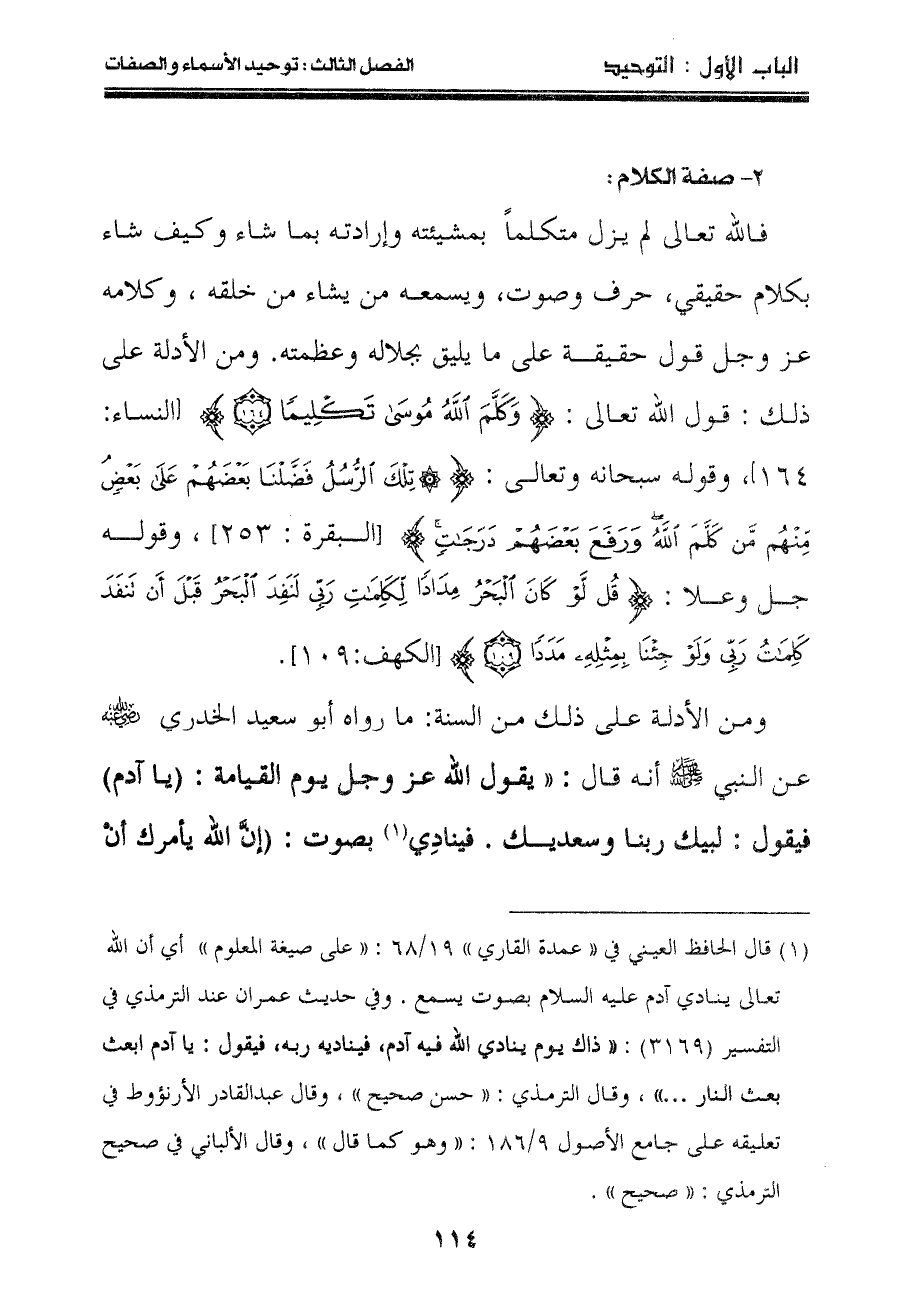 فالله تعالى لم يزل متكلماً بمشيئته وإرادته بما شاء وكيف شاء بكلام حقيقي، حرف وصوت، ويسمعه من يشاء من خلقه، وكلامه عز وجل قول حقيقة على ما يليق بجلاله وعظمته. ومن الأدلة على ذلك: قول الله تعالى: {وَكَلَّمَ اللَّهُ مُوسَى تَكْلِيماً} [النساء:١٦٤] ، وقوله جل وعلا: {تِلْكَ الرُّسُلُ فَضَّلْنَا بَعْضَهُمْ عَلَى بَعْضٍ مِنْهُمْ مَنْ كَلَّمَ اللَّهُ وَرَفَعَ بَعْضَهُمْ دَرَجَاتٍ} وقوله جل وعلا: {قُلْ لَوْ كَانَ الْبَحْرُ مِدَاداً لِكَلِمَاتِ رَبِّي لَنَفِدَ الْبَحْرُ قَبْلَ أَنْ تَنْفَدَ كَلِمَاتُ رَبِّي وَلَوْ جِئْنَا بِمِثْلِهِ مَدَداً} [الكهف:١٠٩] .