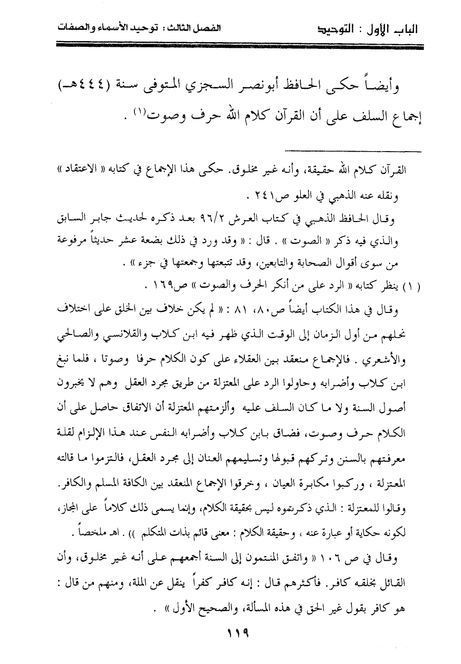 وأيضاً حكى الحافظ أبونصر السجزي المتوفى سنة "٤٤٤هـ" إجماع السلف على أن القرآن كلام الله حرف وصوت"١".
