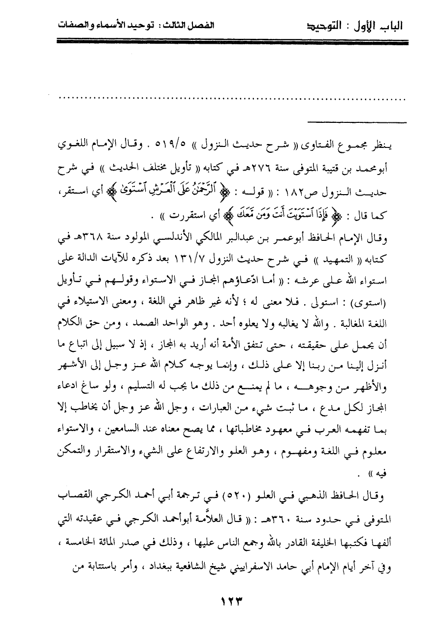 وقال الإمام الحافظ أبوعمر بن عبد البر المالكي الأندلسي المولود سنة ٣٦٨هـ في كتابه "التمهيد "في شرح حديث النزول ٧/١٣١ بعد ذكره للآيات الدالة على استواء الله على عرشه: "أما ادّعاؤهم المجاز في الاستواء وقولهم في تأويل "استوى": استولى. فلا معنى له؛ لأنه غير ظاهر في اللغة، ومعنى الاستيلاء في اللغة المغالبة. والله لا يغالبه ولا يعلوه أحد. وهو الواحد الصمد، ومن حق الكلام أن يحمل على حقيقته، حتى تتفق الأمة أنه أريد به المجاز، إذ لا سبيل إلى اتباع ما أنزل إلينا من ربنا إلا على ذلك، وإنما يوجه كلام الله عز وجل إلى الأشهر والأظهر من وجوهه، ما لم يمنع من ذلك ما يجب له التسليم، ولو ساغ ادعاء المجاز لكل مدع، ما ثبت شيء من العبارات، وجل الله عز وجل أن يخاطب إلا بما تفهمه العرب في معهود مخاطباتها، مما يصح معناه عند السامعين، والاستواء معلوم في اللغة ومفهوم، وهو العلو والارتفاع على الشيء والاستقرار والتمكن فيه".