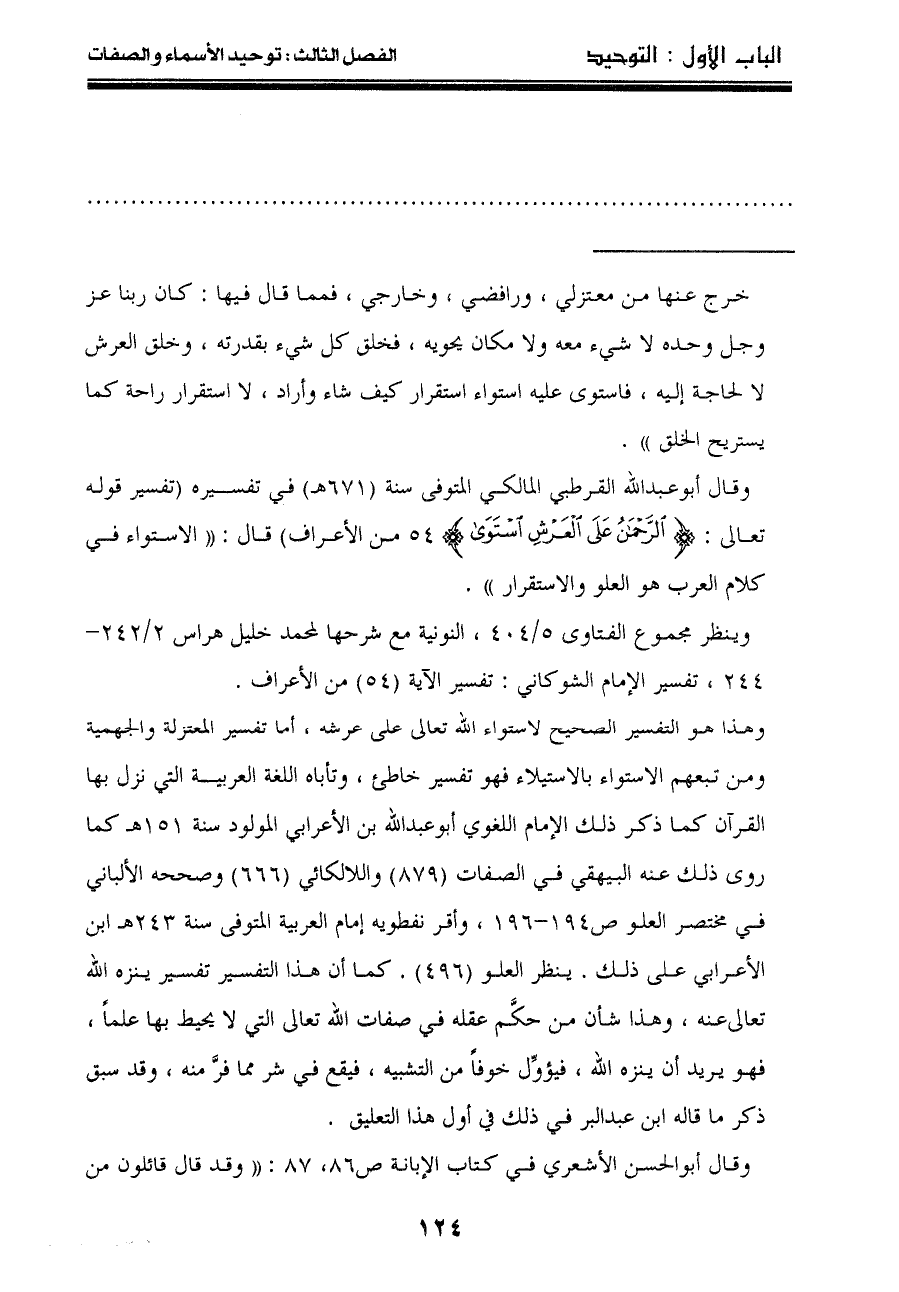 وهذا هو التفسير الصحيح لاستواء الله تعالى على عرشه، أما تفسير المعتزلة والجهمية ومن تبعهم الاستواء بالاستيلاء فهو تفسير خاطئ، وتأباه اللغة العربية التي نزل بها القرآن كما ذكر ذلك الإمام اللغوي أبوعبد الله بن الأعرابي المولود سنة ١٥١هـ كما روى ذلك عنه البيهقي في الصفات "٨٧٩" واللالكائي "٦٦٦" وصححه الألباني في مختصر العلو ص١٩٤-١٩٦، وأقر نفطويه إمام العربية المتوفى سنة ٢٤٣هـ ابن الأعرابي على ذلك. ينظر العلو "٤٩٦". كما أن هذا التفسير تفسير ينزه الله تعالىعنه، وهذا شأن من حكَّم عقله في صفات الله تعالى التي لا يحيط بها علماً، فهو يريد أن ينزه الله، فيؤوِّل خوفاً من التشبيه، فيقع في شر مما فرَّ منه، وقد سبق ذكر ما قاله ابن عبد البر في ذلك في أول هذا التعليق.