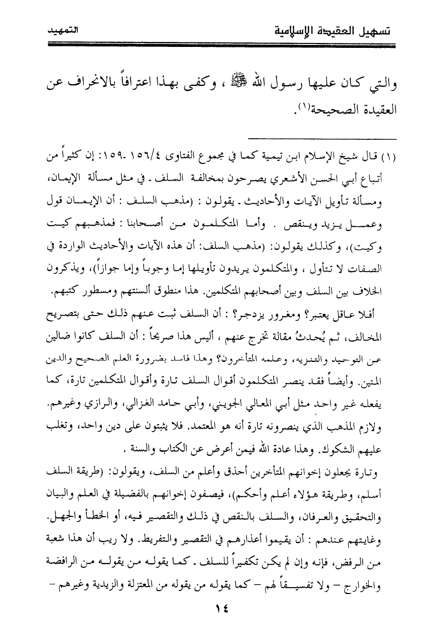 "١" قال شيخ الإسلام ابن تيمية كما في مجموع الفتاوى ٤/١٥٦ ١٥٩: إن كثيراً من أتباع أبي الحسن الأشعري يصرحون بمخالفة السلف في مثل مسألة الإيمان، ومسألة تأويل الآيات والأحاديث يقولون: "مذهب السلف: أن الإيمان قول وعمل يزيد وينقص. وأما المتكلمون من أصحابنا: فمذهبهم كيت وكيت"، وكذلك يقولون: "مذهب السلف: أن هذه الآيات والأحاديث الواردة في الصفات لا تتأول، والمتكلمون يريدون تأويلها إما وجوباً وإما جوازاً"، ويذكرون الخلاف بين السلف وبين أصحابهم المتكلمين. هذا منطوق ألسنتهم ومسطور كتبهم.