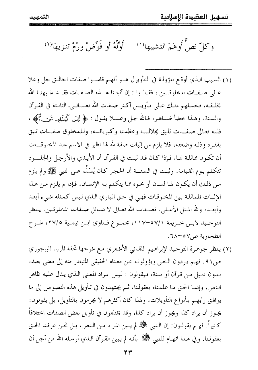 وكلّ نصٍّ أَوهَمَ التشبيها"١" ... أَوِّلْهُ أو فَوِّضْ ورُمْ تنزيهَا"٢"