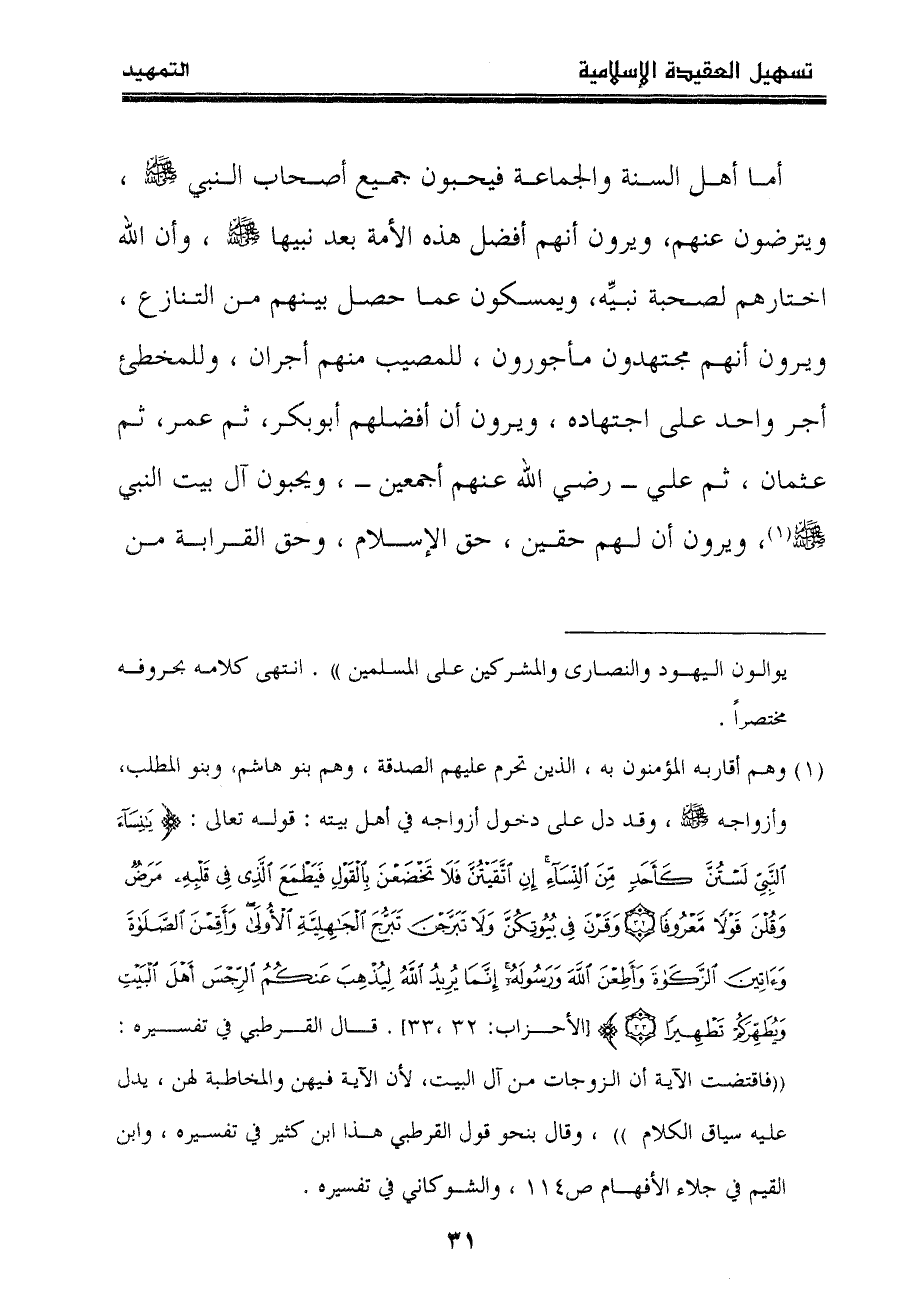 أما أهل السنة والجماعة فيحبون جميع أصحاب النبي صلى الله عليه وسلم، ويترضون عنهم، ويرون أنهم أفضل هذه الأمة بعد نبيها صلى الله عليه وسلم، وأن الله اختارهم لصحبة نبيِّه، ويمسكون عما حصل بينهم من التنازع، ويرون أنهم مجتهدون مأجورون، للمصيب منهم أجران، وللمخطئ أجر واحد على اجتهاده، ويرون أن أفضلهم أبوبكر، ثم عمر، ثم عثمان، ثم علي رضي الله عنهم أجمعين، ويحبون آل بيت النبي صلى الله عليه وسلم "١"، ويرون أن لهم حقان، حق الإسلام، وحق القرابة من