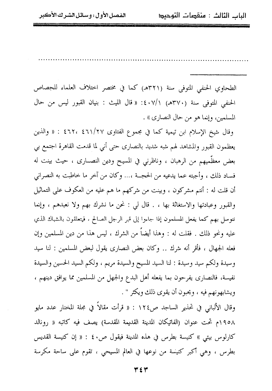 وقال شيخ الإسلام ابن تيمية كما في مجموع الفتاوى ٢٧/٤٦١،٤٦٢:"والذين يعظمون القبور والمشاهد لهم شبه شديد بالنصارى حتى أني لما قدمت القاهرة اجتمع بي بعض معظّميهم من الرهبان، وناظرني في المسيح ودين النصارى، حيث بينت له فساد ذلك، وأجبته عما يدعيه من الحجة،... وكان من آخر ما خاطبت به النصراني أن قلت له: أنتم مشركون، وبينت من شركهم ما هم عليه من العكوف على التماثيل والقبور وعبادتها والاستغاثة بها،. قال لي: نحن ما نشرك بهم ولا نعبدهم، وإنما نتوسل بهم كما يفعل المسلمون إذا جاءوا إلى قبر الرجل الصالح، فيتعلقون بالشباك الذي عليه ونحو ذلك. فقلت له: وهذا أيضاً من الشرك، ليس هذا من دين المسلمين وإن فعله الجهال، فأقر أنه شرك.. وكان بعض النصارى يقول لبعض المسلمين: لنا سيد وسيدة ولكم سيد وسيدة: لنا السيد المسيح والسيدة مريم، ولكم السيد الحسين والسيدة نفيسة، فالنصارى يفرحون بما يفعله أهل البدع والجهل من المسلمين مما يوافق دينهم، ويشابهونهم فيه، ويحبون أن يقوى ذلك ويكثر".