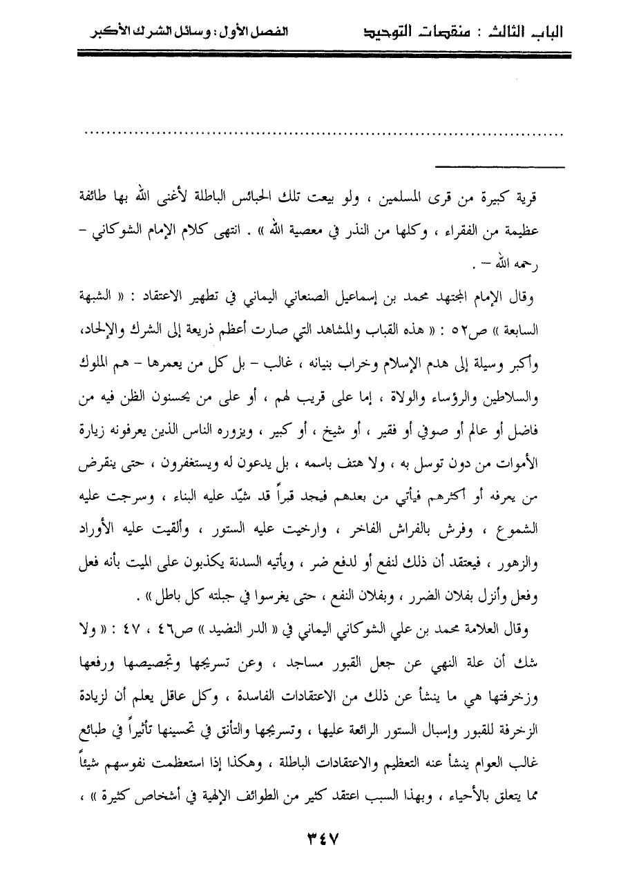 قرية كبيرة من قرى المسلمين، ولو بيعت تلك الحبائس الباطلة لأغنى الله بها طائفة عظيمة من الفقراء، وكلها من النذر في معصية الله". انتهى كلام الإمام الشوكاني – رحمه الله -.