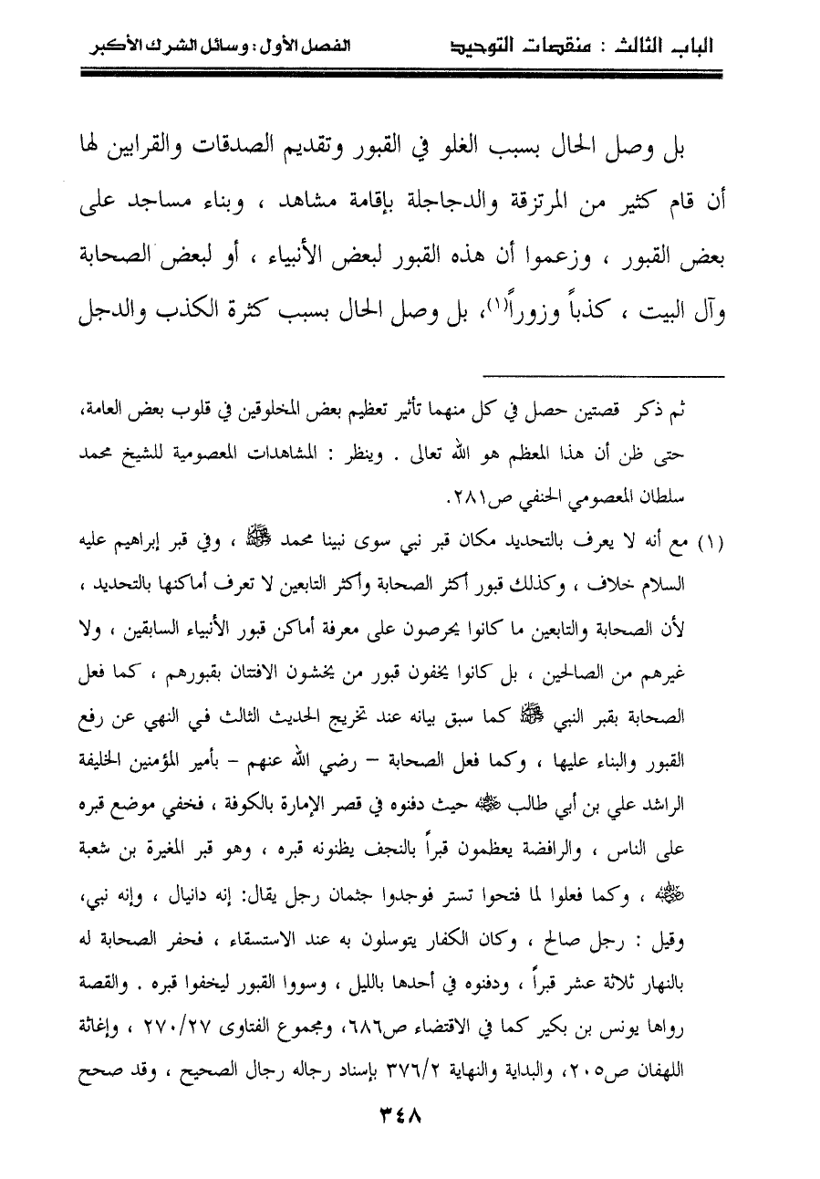 "١" مع أنه لا يعرف بالتحديد مكان قبر نبي سوى نبينا محمد صلى الله عليه وسلم، وفي قبر إبراهيم عليه السلام خلاف، وكذلك قبور أكثر الصحابة وأكثر التابعين لا تعرف أماكنها بالتحديد، لأن الصحابة والتابعين ما كانوا يحرصون على معرفة أماكن قبور الأنبياء السابقين، ولا غيرهم من الصالحين، بل كانوا يخفون قبور من يخشون الافتتان بقبورهم، كما فعل الصحابة بقبر النبي صلى الله عليه وسلم كما سبق بيانه عند تخريج الحديث الثالث في النهي عن رفع القبور والبناء عليها، وكما فعل الصحابة - رضي الله عنهم – بأمير المؤمنين الخليفة الراشد علي بن أبي طالب رضي الله عنه حيث دفنوه في قصر الإمارة بالكوفة، فخفي موضع قبره على الناس، والرافضة يعظمون قبراً بالنجف يظنونه قبره، وهو قبر المغيرة بن شعبة رضي الله عنه، وكما فعلوا لما فتحوا تستر فوجدوا جثمان رجل يقال: إنه دانيال، وإنه نبي، وقيل: رجل صالح، وكان الكفار يتوسلون به عند الاستسقاء، فحفر الصحابة له بالنهار ثلاثة عشر قبراً، ودفنوه في أحدها بالليل، وسووا القبور ليخفوا قبره. والقصة رواها يونس بن بكير كما في الاقتضاء ص٦٨٦، ومجموع الفتاوى ٢٧/٢٧٠، وإغاثة اللهفان ص٢٠٥، والبداية والنهاية ٢/٣٧٦ بإسناد رجاله رجال الصحيح، وقد صحح