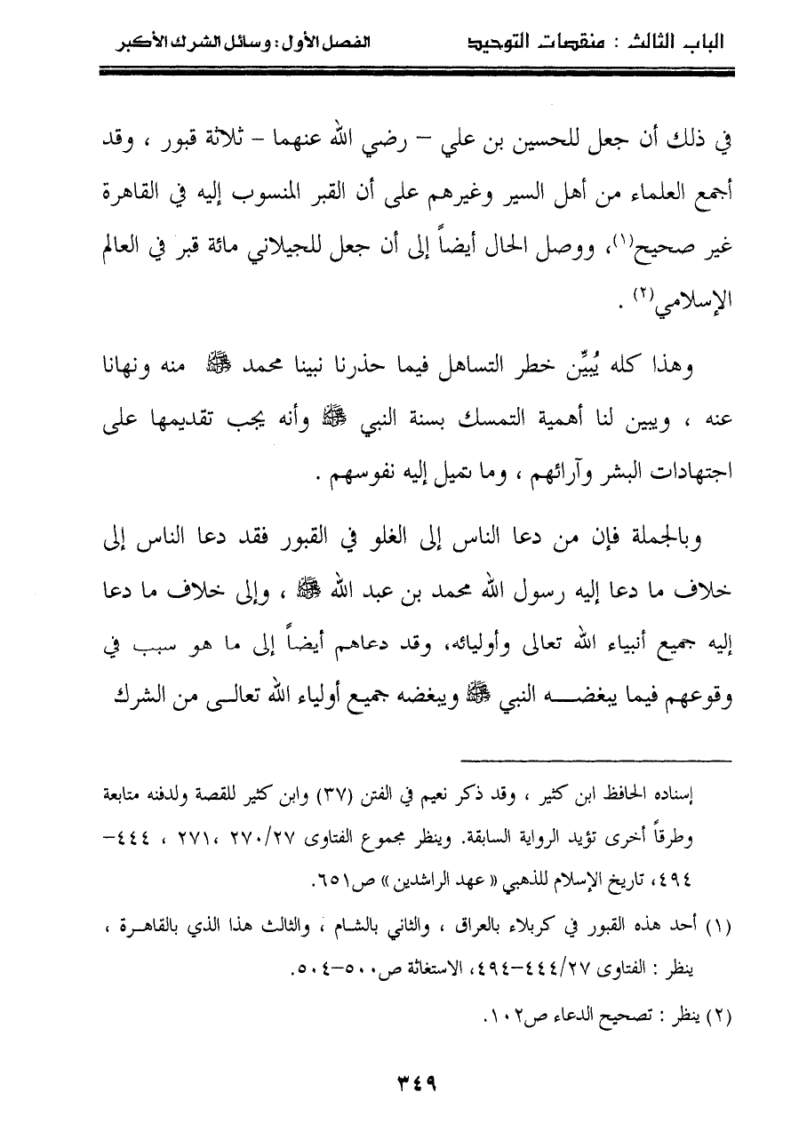 في ذلك أن جعل للحسين بن علي - رضي الله عنهما – ثلاثة قبور، وقد أجمع العلماء من أهل السير وغيرهم على أن القبر المنسوب إليه في القاهرة غير صحيح"١"، ووصل الحال أيضاً إلى أن جعل للجيلاني مائة قبر في العالم الإسلامي"٢".