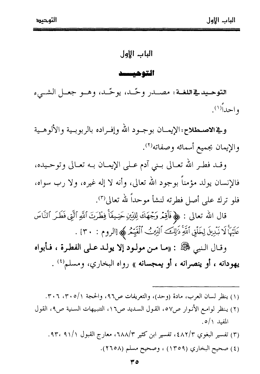 وقد فطر الله تعالى بني آدم على الإيمان به تعالى وتوحيده، فالإنسان يولد مؤمناً بوجود الله تعالى، وأنه لا إله غيره، ولا رب سواه، فلو ترك على أصل فطرته لنشأ موحداً لله تعالى (٣) .