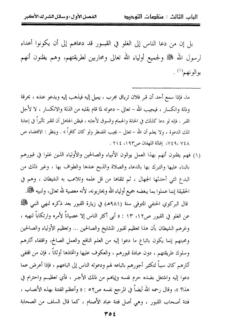 بل إن من دعا الناس إلى الغلو في القبور قد دعاهم إلى أن يكونوا أعداء لرسول الله صلى الله عليه وسلم ولجميع أولياء الله تعالى ومحاربين لطريقتهم، وهم يظنون أنهم يوالونهم"١".