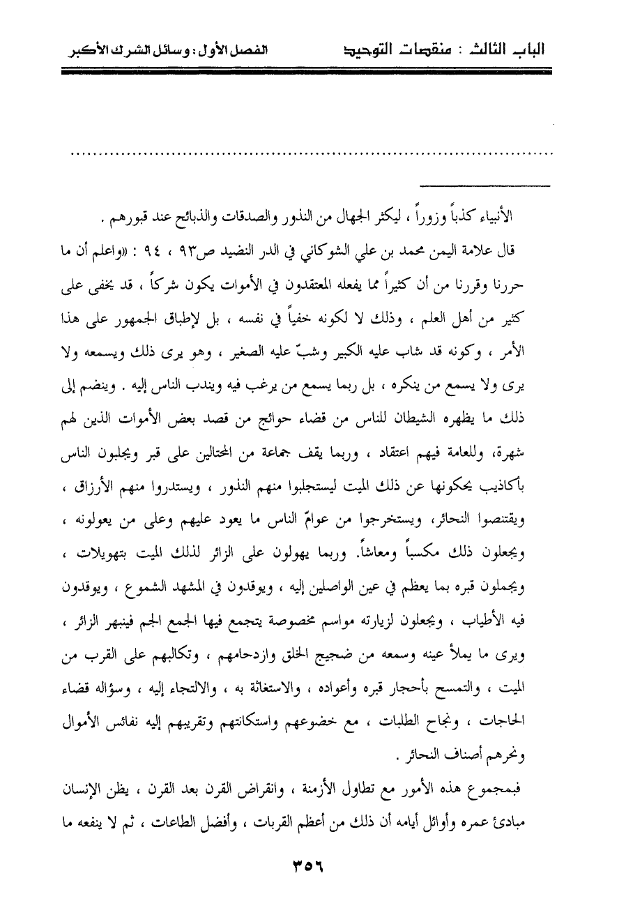 قال علامة اليمن محمد بن علي الشوكاني في الدر النضيد ص٩٣، ٩٤: "واعلم أن ما حررنا وقررنا من أن كثيراً مما يفعله المعتقدون في الأموات يكون شركاً، قد يخفى على كثير من أهل العلم، وذلك لا لكونه خفياً في نفسه، بل لإطباق الجمهور على هذا الأمر، وكونه قد شاب عليه الكبير وشبّ عليه الصغير، وهو يرى ذلك ويسمعه ولا يرى ولا يسمع من ينكره، بل ربما يسمع من يرغب فيه ويندب الناس إليه. وينضم إلى ذلك ما يظهره الشيطان للناس من قضاء حوائج من قصد بعض الأموات الذين لهم شهرة، وللعامة فيهم اعتقاد، وربما يقف جماعة من المحتالين على قبر ويجلبون الناس بأكاذيب يحكونها عن ذلك الميت ليستجلبوا منهم النذور، ويستدروا منهم الأرزاق، ويقتنصوا النحائر، ويستخرجوا من عوامّ الناس ما يعود عليهم وعلى من يعولونه، ويجعلون ذلك مكسباً ومعاشاً. وربما يهولون على الزائر لذلك الميت بتهويلات، ويجملون قبره بما يعظم في عين الواصلين إليه، ويوقدون في المشهد الشموع، ويوقدون فيه الأطياب، ويجعلون لزيارته مواسم مخصوصة يتجمع فيها الجمع الجم فينبهر الزائر، ويرى ما يملأ عينه وسمعه من ضجيج الخلق وازدحامهم، وتكالبهم على القرب من الميت، والتمسح بأحجار قبره وأعواده، والاستغاثة به، والالتجاء إليه، وسؤاله قضاء الحاجات، ونجاح الطلبات، مع خضوعهم واستكانتهم وتقريبهم إليه نفائس الأموال ونحرهم أصناف النحائر.