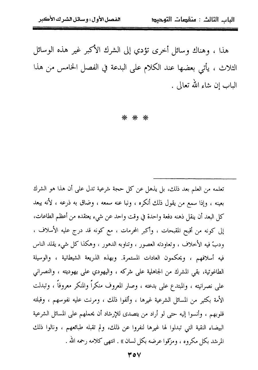 هذا، وهناك وسائل أخرى تؤدي إلى الشرك الأكبر غير هذه الوسائل الثلاث، يأتي بعضها عند الكلام على البدعة في الفصل الخامس من هذا الباب إن شاء الله تعالى.