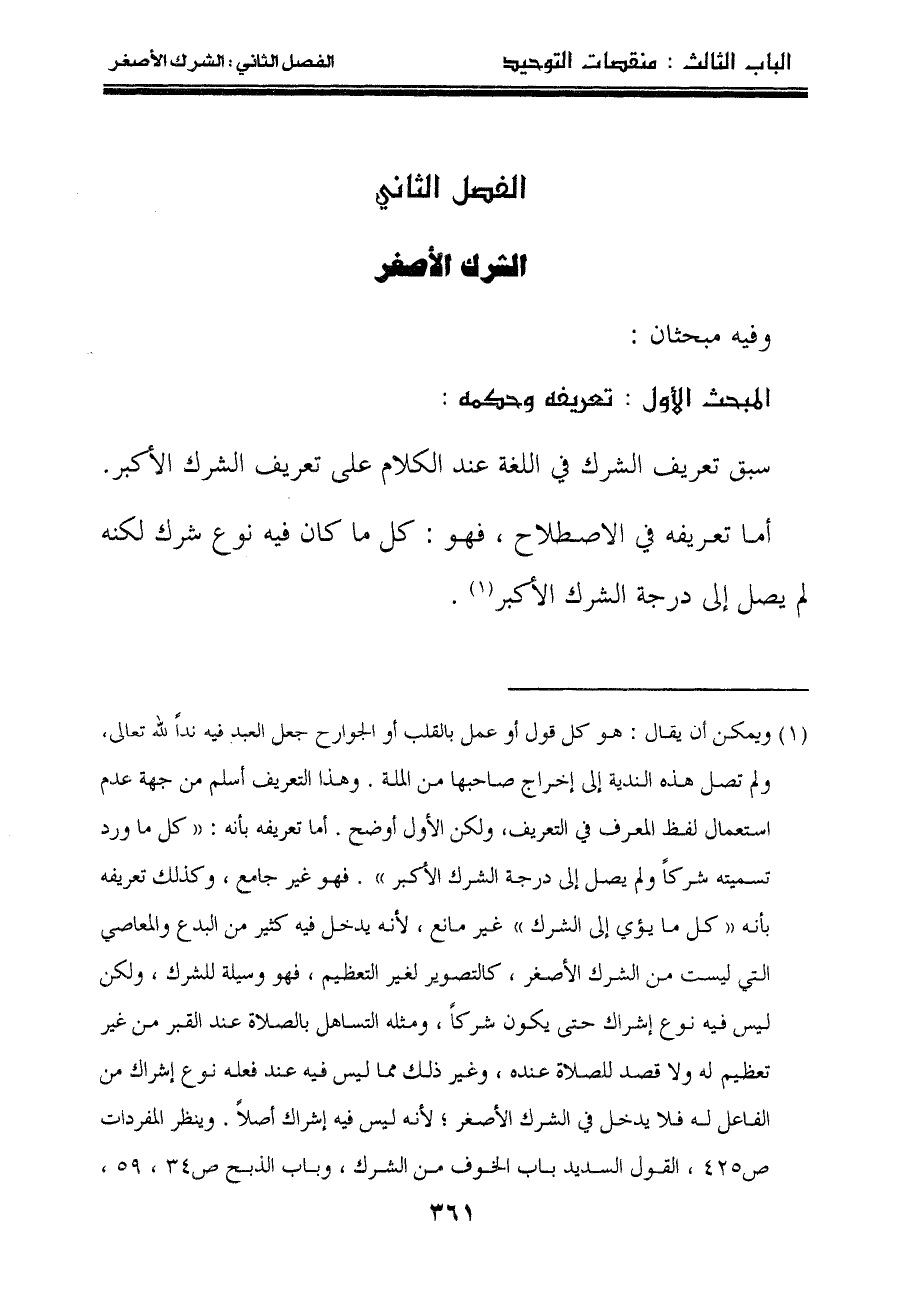 "١" ويمكن أن يقال: هو كل قول أو عمل بالقلب أو الجوارح جعل العبد فيه نداً لله تعالى، ولم تصل هذه الندية إلى إخراج صاحبها من الملة. وهذا التعريف أسلم من جهة عدم استعمال لفظ المعرف في التعريف، ولكن الأول أوضح. أما تعريفه بأنه: "كل ما ورد تسميته شركاً ولم يصل إلى درجة الشرك الأكبر". فهو غير جامع، وكذلك تعريفه بأنه "كل ما يؤي إلى الشرك"غير مانع، لأنه يدخل فيه كثير من البدع والمعاصي التي ليست من الشرك الأصغر، كالتصوير لغير التعظيم، فهو وسيلة للشرك، ولكن ليس فيه نوع إشراك حتى يكون شركاً، ومثله التساهل بالصلاة عند القبر من غير تعظيم له ولا قصد للصلاة عنده، وغير ذلك مما ليس فيه عند فعله نوع إشراك من الفاعل له فلا يدخل في الشرك الأصغر؛ لأنه ليس فيه إشراك أصلاً. وينظر المفردات ص٤٢٥، القول السديد باب الخوف من الشرك، وباب الذبح ص٣٤، ٥٩،