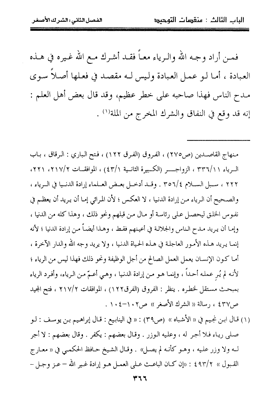 "١" قال ابن نجيم في "الأشباه""ص٣٩": "في الينابيع: قال إبراهيم بن يوسف: لو صلى رياء فلا أجر له، وعليه الوزر. وقال بعضهم: يكفر. وقال بعضهم: لا أجر له ولا وزر عليه، وهو كأنه لم يصل". وقال الشيخ حافظ الحكمي في "معارج القبول"٢/٤٩٣: "إن كان الباعث على العمل هو إرادة غير الله - عز وجل –