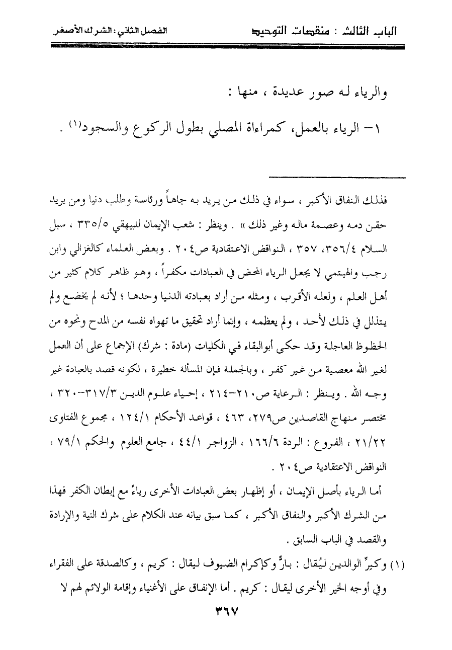فذلك النفاق الأكبر، سواء في ذلك من يريد به جاهاً ورئاسة وطلب دنيا ومن يريد حقن دمه وعصمة ماله وغير ذلك". وينظر: شعب الإيمان للبيهقي ٥/٣٣٥، سبل السلام ٤/٣٥٦، ٣٥٧، النواقض الاعتقادية ص٢٠٤. وبعض العلماء كالغزالي وابن رجب والهيتمي لا يجعل الرياء المحض في العبادات مكفراً، وهو ظاهر كلام كثير من أهل العلم، ولعله الأقرب، ومثله من أراد بعبادته الدنيا وحدها؛ لأنه لم يخضع ولم يتذلل في ذلك لأحد، ولم يعظمه، وإنما أراد تحقيق ما تهواه نفسه من المدح ونحوه من الحظوظ العاجلة وقد حكى أبوالبقاء في الكليات "مادة: شرك" الإجماع على أن العمل لغير الله معصية من غير كفر، وبالجملة فإن المسألة خطيرة، لكونه قصد بالعبادة غير وجه الله. وينظر: الرعاية ص٢١٠-٢١٤، إحياء علوم الدين ٣/٣١٧-٣٢٠، مختصر منهاج القاصدين ص٢٧٩، ٤٦٣، قواعد الأحكام ١/١٢٤، مجموع الفتاوى ٢٢/٢١، الفروع: الردة ٦/١٦٦، الزواجر ١/٤٤، جامع العلوم والحكم ١/٧٩، النواقض الاعتقادية ص٢٠٤.
