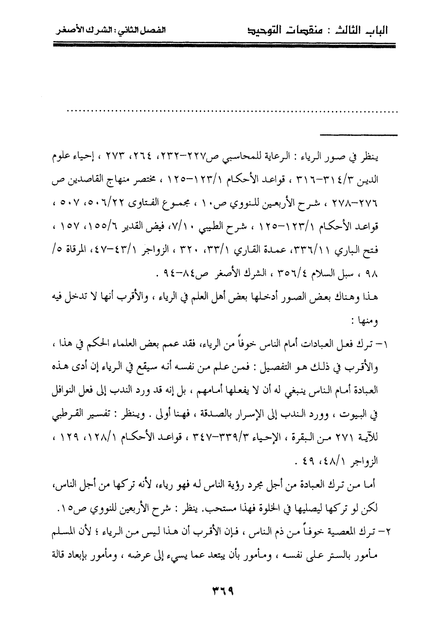 ينظر في صور الرياء: الرعاية للمحاسبي ص٢٢٧-٢٣٢، ٢٦٤، ٢٧٣، إحياء علوم الدين ٣/٣١٤-٣١٦، قواعد الأحكام ١/١٢٣-١٢٥، مختصر منهاج القاصدين ص٢٧٦-٢٧٨، شرح الأربعين للنووي ص١٠، مجموع الفتاوى ٢٢/٥٠٦، ٥٠٧، قواعد الأحكام ١/١٢٣-١٢٥، شرح الطيبي ١٠/٧، فيض القدير ٦/١٥٥، ١٥٧، فتح الباري ١١/٣٣٦، عمدة القاري ١/٣٣، ٣٢٠، الزواجر ١/٤٣-٤٧، المرقاة ٥/٩٨، سبل السلام ٤/٣٥٦، الشرك الأصغر ص٨٤-٩٤.