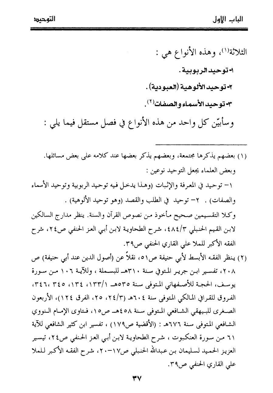 وبعض العلماء يجعل التوحيد نوعين: ١- توحيد في المعرفة والإثبات (وهذا يدخل فيه توحيد الربوبية وتوحيد الأسماء والصفات) . ٢- توحيد في الطلب والقصد (وهو توحيد الألوهية) . وكلا التقسيمين صحيح مأخوذ من نصوص القرآن والسنة. ينظر مدارج السالكين لابن القيم الحنبلي ٣/٤٨٤، شرح الطحاوية لابن أبي العز الحنفي ص٢٤، شرح الفقه الأكبر للملا علي القاري الحنفي ص٣٩.