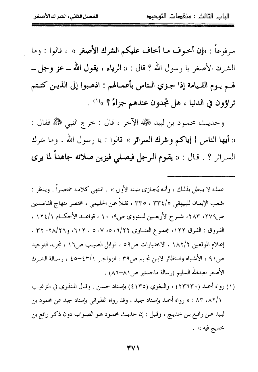 مرفوعاً: " إن أخوف ما أخاف عليكم الشرك الأصغر "، قالوا: وما الشرك الأصغر يا رسول الله؟ قال: " الرياء، يقول الله عز وجل لهم يوم القيامة إذا جزي الناس بأعمالهم: اذهبوا إلى الذين كنتم تراؤون في الدنيا، هل تجدون عندهم جزاءً؟ " "١".