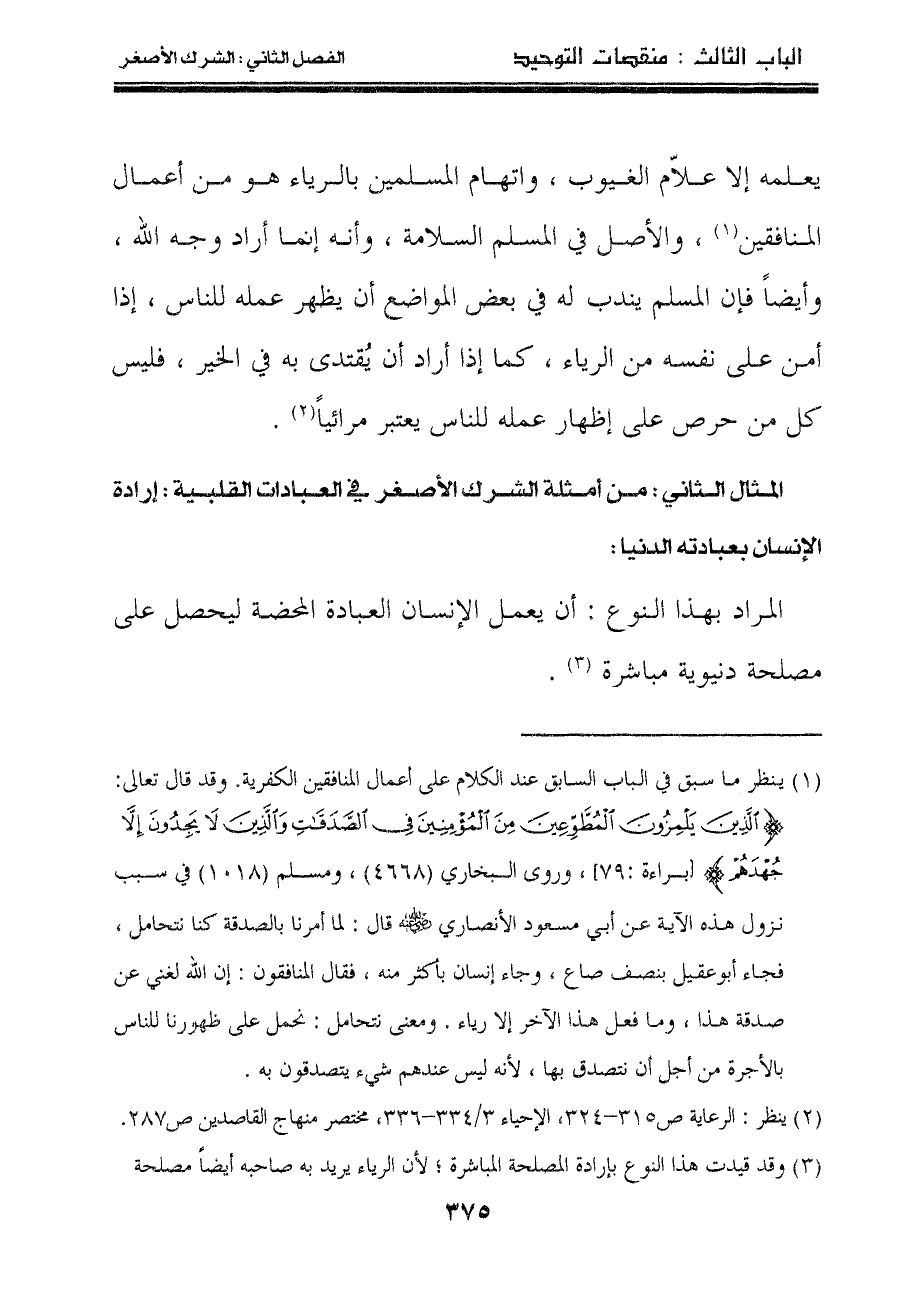 "٣" وقد قيدت هذا النوع بإرادة المصلحة المباشرة؛ لأن الرياء يريد به صاحبه أيضاً مصلحة