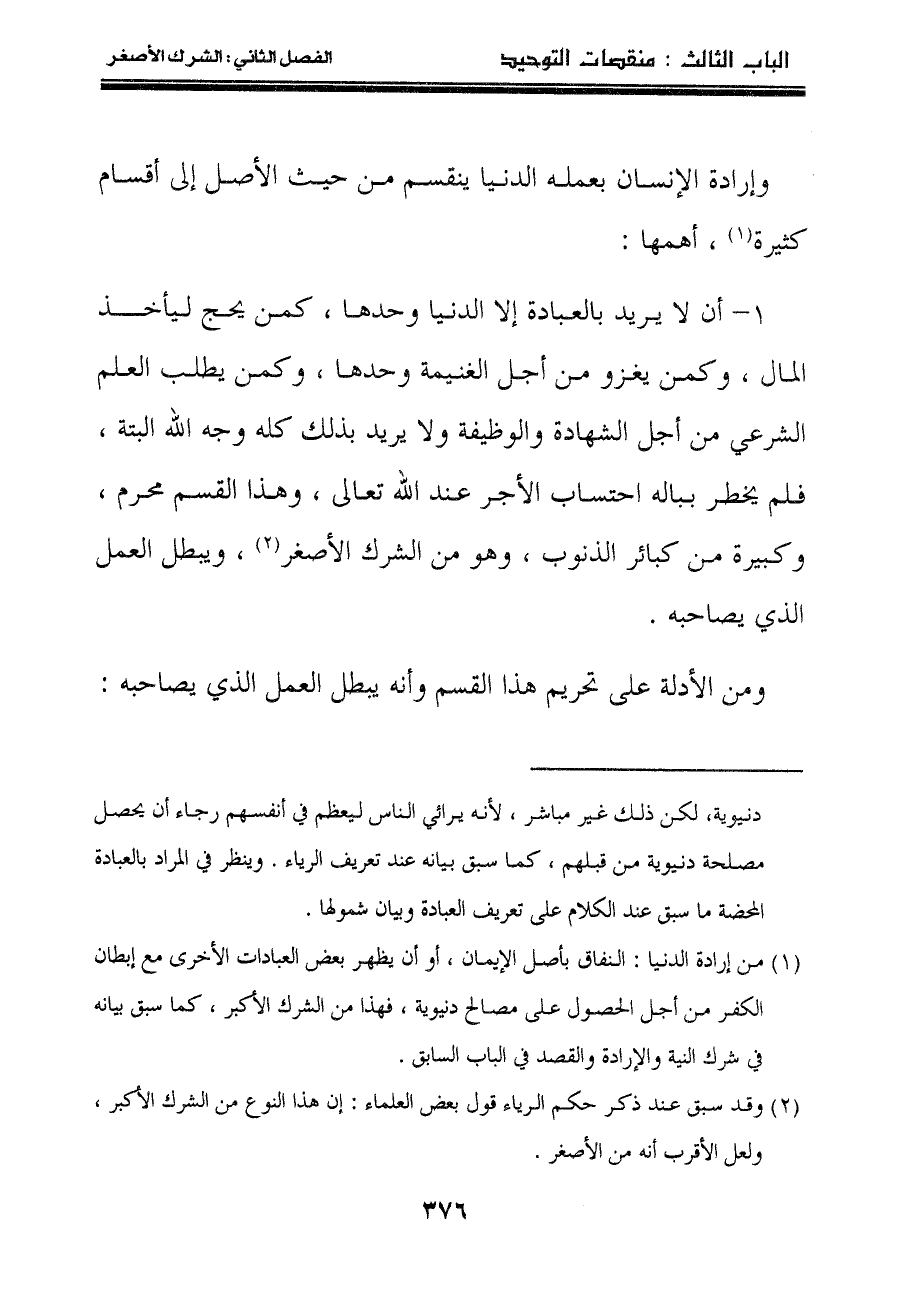"١" من إرادة الدنيا: النفاق بأصل الإيمان، أو أن يظهر بعض العبادات الأخرى مع إبطان الكفر من أجل الحصول على مصالح دنيوية، فهذا من الشرك الأكبر، كما سبق بيانه في شرك النية والإرادة والقصد في الباب السابق.
