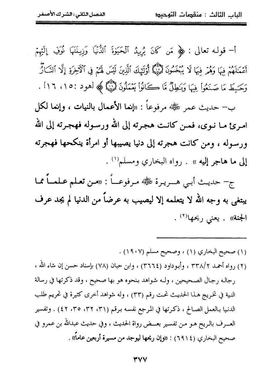 "٢" رواه أحمد ٢/٣٣٨، وأبوداود "٣٦٦٤"، وابن حبان "٧٨" بإسناد حسن إن شاء الله، رجاله رجال الصحيحين، وله شواهد بنحوه هو بها صحيح، وقد ذكرتها في رسالة النية في تخريج هذا الحديث تحت رقم "٣٣"، وله شواهد أخرى كثيرة في تحريم طلب الدنيا بالعمل الصالح، ذكرتها في المرجع نفسه برقم "٣١، ٣٢، ٣٥، ٤٢". وتفسير العرف بالريح هو من تفسير بعض رواة الحديث، وفي حديث عبد الله بن عمرو في صحيح البخاري "٦٩١٤": " وإن ريحها ليوجد من مسيرة أربعين عاماً ".