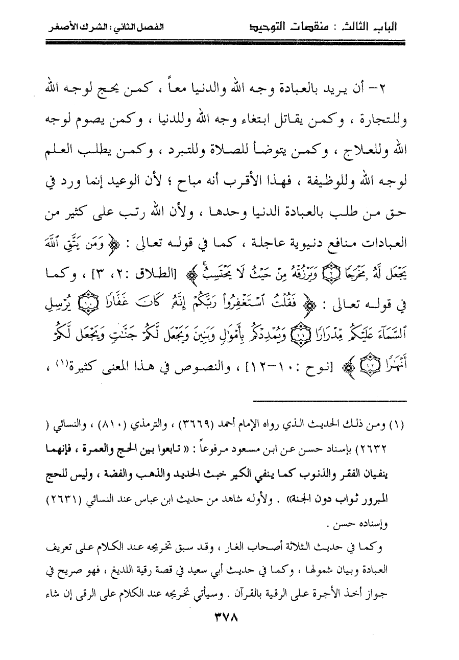 ٢ - أن يريد بالعبادة وجه الله والدنيا معاً، كمن يحج لوجه الله وللتجارة، وكمن يقاتل ابتغاء وجه الله وللدنيا، وكمن يصوم لوجه الله وللعلاج، وكمن يتوضأ للصلاة وللتبرد، وكمن يطلب العلم لوجه الله وللوظيفة، فهذا الأقرب أنه مباح؛ لأن الوعيد إنما ورد في حق من طلب بالعبادة الدنيا وحدها، ولأن الله رتب على كثير من العبادات منافع دنيوية عاجلة، كما في قوله تعالى: {وَمَنْ يَتَّقِ اللَّهَ يَجْعَلْ لَهُ مَخْرَجاً وَيَرْزُقْهُ مِنْ حَيْثُ لا يَحْتَسِبُ} [الطلاق:٢، ٣] ، وكما في قوله تعالى: {فَقُلْتُ اسْتَغْفِرُوا رَبَّكُمْ إِنَّهُ كَانَ غَفَّاراً يُرْسِلِ السَّمَاءَ عَلَيْكُمْ مِدْرَاراً وَيُمْدِدْكُمْ بِأَمْوَالٍ وَبَنِينَ وَيَجْعَلْ لَكُمْ جَنَّاتٍ وَيَجْعَلْ لَكُمْ أَنْهَاراً} [نوح:١٠-١٢] ، والنصوص في هذا المعنى كثيرة"١"،