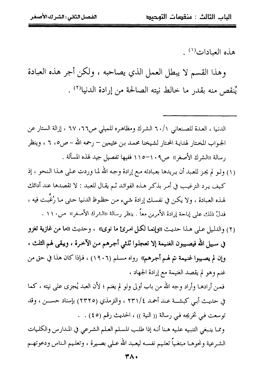 وهذا القسم لا يبطل العمل الذي يصاحبه، ولكن أجر هذه العبادة يُنقص منه بقدر ما خالط نيته الصالحة من إرادة الدنيا"٢".