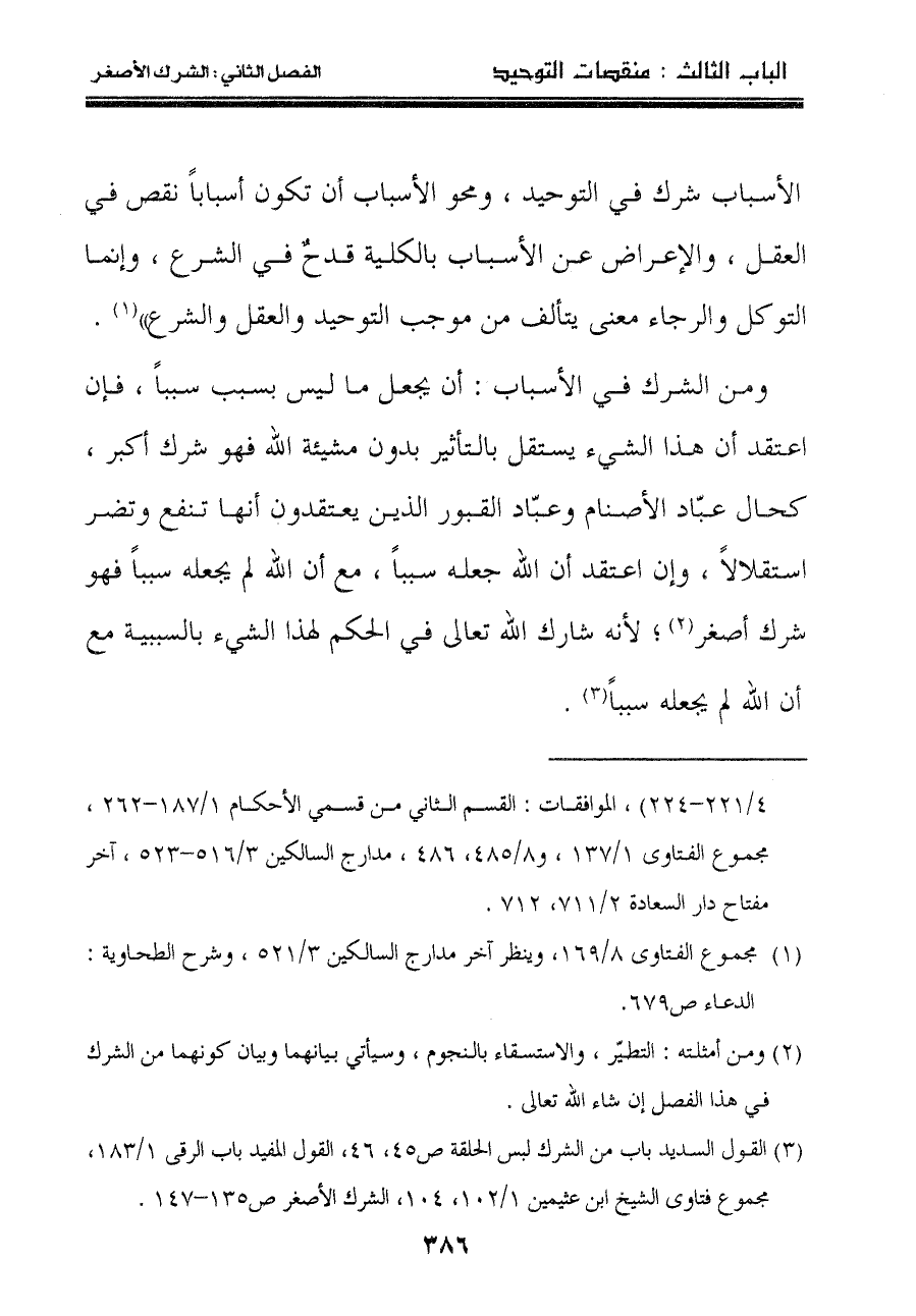 ومن الشرك في الأسباب: أن يجعل ما ليس بسبب سبباً، فإن اعتقد أن هذا الشيء يستقل بالتأثير بدون مشيئة الله فهو شرك أكبر، كحال عبّاد الأصنام وعبّاد القبور الذين يعتقدون أنها تنفع وتضر استقلالاً، وإن اعتقد أن الله جعله سبباً، مع أن الله لم يجعله سبباً فهو شرك أصغر"٢"؛ لأنه شارك الله تعالى في الحكم لهذا الشيء بالسببية مع أن الله لم يجعله سبباً"٣".