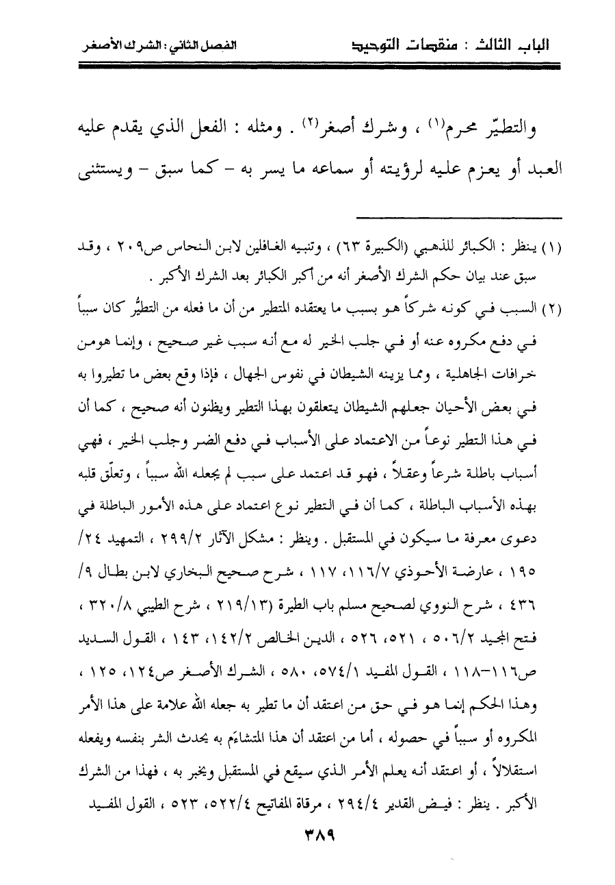"٢" السبب في كونه شركاً هو بسبب ما يعتقده المتطير من أن ما فعله من التطيُّر كان سبباً في دفع مكروه عنه أو في جلب الخير له مع أنه سبب غير صحيح، وإنما هومن خرافات الجاهلية، ومما يزينه الشيطان في نفوس الجهال، فإذا وقع بعض ما تطيروا به في بعض الأحيان جعلهم الشيطان يتعلقون بهذا التطير ويظنون أنه صحيح، كما أن في هذا التطير نوعاً من الاعتماد على الأسباب في دفع الضر وجلب الخير، فهي أسباب باطلة شرعاً وعقلاً، فهو قد اعتمد على سبب لم يجعله الله سبباً، وتعلّق قلبه بهذه الأسباب الباطلة، كما أن في التطير نوع اعتماد على هذه الأمور الباطلة في دعوى معرفة ما سيكون في المستقبل. وينظر: مشكل الآثار ٢/٢٩٩، التمهيد ٢٤/١٩٥، عارضة الأحوذي ٧/١١٦، ١١٧، شرح صحيح البخاري لابن بطال ٩/٤٣٦، شرح النووي لصحيح مسلم باب الطيرة "١٣/٢١٩، شرح الطيبي ٨/٣٢٠، فتح المجيد ٢/٥٠٦، ٥٢١، ٥٢٦، الدين الخالص ٢/١٤٢، ١٤٣، القول السديد ص١١٦-١١٨، القول المفيد ١/٥٧٤، ٥٨٠، الشرك الأصغر ص١٢٤، ١٢٥، وهذا الحكم إنما هو في حق من اعتقد أن ما تطير به جعله الله علامة على هذا الأمر المكروه أو سبباً في حصوله، أما من اعتقد أن هذا المتشاءَم به يحدث الشر بنفسه ويفعله استقلالاً، أو اعتقد أنه يعلم الأمر الذي سيقع في المستقبل ويخبر به، فهذا من الشرك الأكبر. ينظر: فيض القدير ٤/٢٩٤، مرقاة المفاتيح ٤/٥٢٢، ٥٢٣، القول المفيد