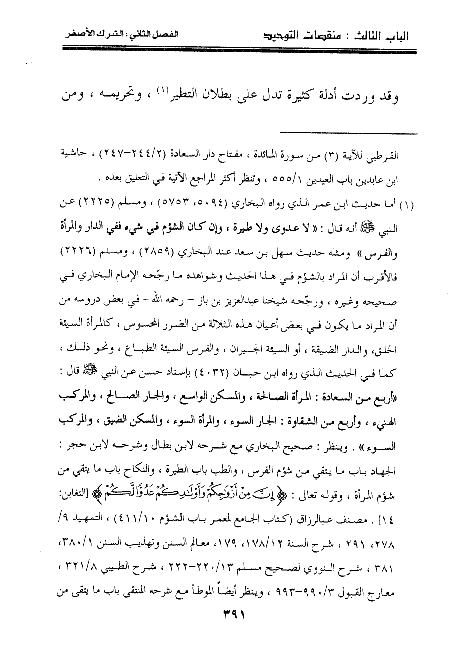 "١" أما حديث ابن عمر الذي رواه البخاري "٥٠٩٤، ٥٧٥٣"، ومسلم "٢٢٢٥" عن النبي صلى الله عليه وسلم أنه قال: " لا عدوى ولا طيرة، وإن كان الشؤم في شيء ففي الدار والمرأة والفرس "ومثله حديث سهل بن سعد عند البخاري "٢٨٥٩"، ومسلم "٢٢٢٦" فالأقرب أن المراد بالشؤم في هذا الحديث وشواهده ما رجّحه الإمام البخاري في صحيحه وغيره، ورجّحه شيخنا عبد العزيز بن باز - رحمه الله – في بعض دروسه من أن المراد ما يكون في بعض أعيان هذه الثلاثة من الضرر المحسوس، كالمرأة السيئة الخلق، والدار الضيقة، أو السيئة الجيران، والفرس السيئة الطباع، ونحو ذلك، كما في الحديث الذي رواه ابن حبان "٤٠٣٢" بإسناد حسن عن النبي صلى الله عليه وسلم قال: " أربع من السعادة: المرأة الصالحة، والمسكن الواسع، والجار الصالح، والمركب الهنيء، وأربع من الشقاوة: الجار السوء، والمرأة السوء، والمسكن الضيق، والمركب السوء ". وينظر: صحيح البخاري مع شرحه لابن بطال وشرحه لابن حجر: الجهاد باب ما يتقي من شؤم الفرس، والطب باب الطيرة، والنكاح باب ما يتقي من شؤم المرأة، وقوله تعالى: {إِنَّ مِنْ أَزْوَاجِكُمْ وَأَوْلادِكُمْ عَدُوّاً لَكُمْ} [التغابن: ١٤] . مصنف عبالرزاق "كتاب الجامع لمعمر باب الشؤم ١٠/٤١١"، التمهيد ٩/٢٧٨، ٢٩١، شرح السنة ١٢/١٧٨، ١٧٩، معالم السنن وتهذيب السنن ١/٣٨٠، ٣٨١، شرح النووي لصحيح مسلم ١٣/٢٢٠-٢٢٢، شرح الطيبي ٨/٣٢١، معارج القبول ٣/٩٩٠-٩٩٣، وينظر أيضاً الموطأ مع شرحه المنتقى باب ما يتقى من