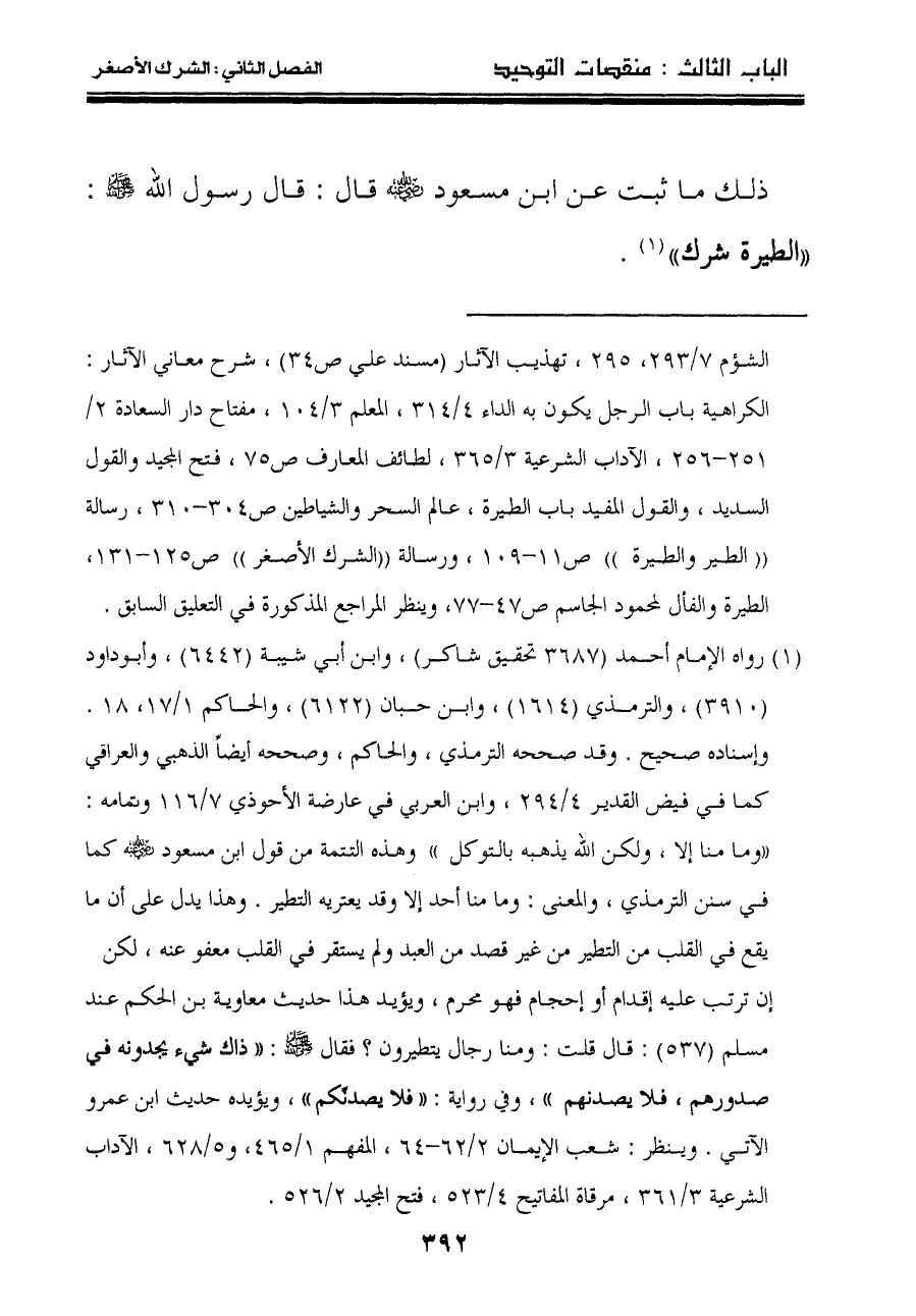 ذلك ما ثبت عن ابن مسعود رضي الله عنه قال: قال رسول الله صلى الله عليه وسلم: " الطيرة شرك ""١".