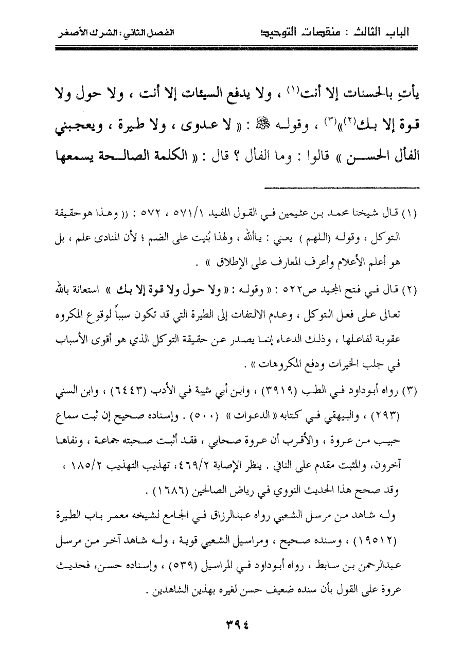 يأتِ بالحسنات إلا أنت "١"، ولا يدفع السيئات إلا أنت، ولا حول ولا قوة إلا بك "٢" ""٣"، وقوله صلى الله عليه وسلم: " لا عدوى، ولا طيرة، ويعجبني الفأل الحسن" قالوا: وما الفأل؟ قال: " الكلمة الصالحة يسمعها