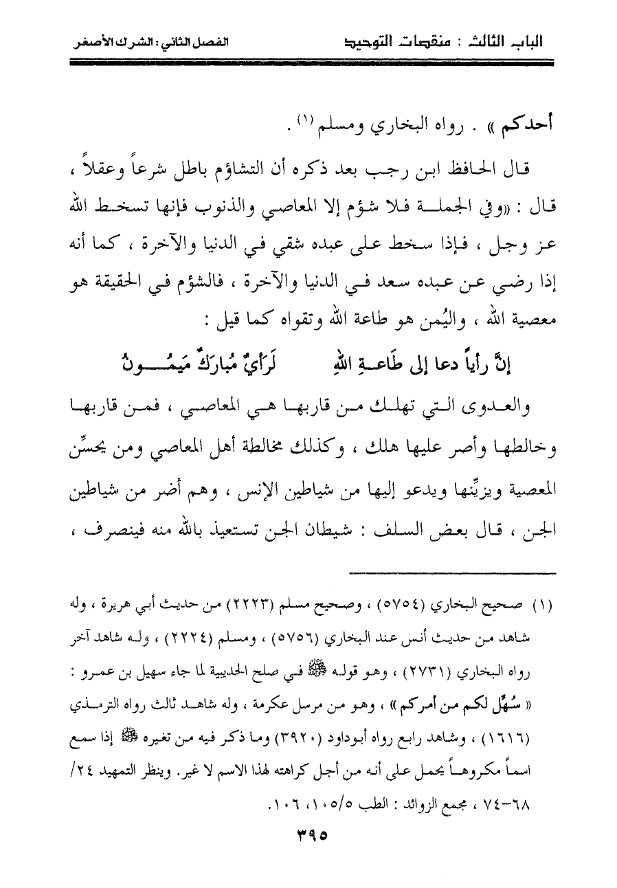 قال الحافظ ابن رجب بعد ذكره أن التشاؤم باطل شرعاً وعقلاً، قال: "وفي الجملة فلا شؤم إلا المعاصي والذنوب فإنها تسخط الله عز وجل، فإذا سخط على عبده شقي في الدنيا والآخرة، كما أنه إذا رضي عن عبده سعد في الدنيا والآخرة، فالشؤم في الحقيقة هو معصية الله، واليُمن هو طاعة الله وتقواه كما قيل: