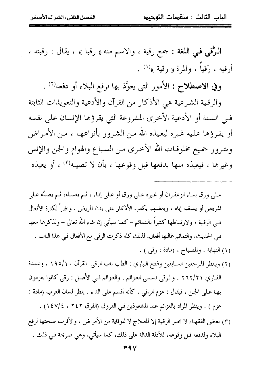 على ورق بماء الزعفران أو غيره على ورق أو على إناء، ثم يغسله، ثم يصبُّه على المريض أو يسقيه إياه، وبعضهم يكتب الأذكار على بدن المريض، ونظراً لكثرة الأفعال في الرقية، ولارتباطها كثيراً بالتمائم – كما سيأتي إن شاء الله تعالى – ولذكرها معها في الحديث، والتمائم غالبها أفعال، لذلك كله ذكرت الرقى مع الأفعال في هذا الباب.