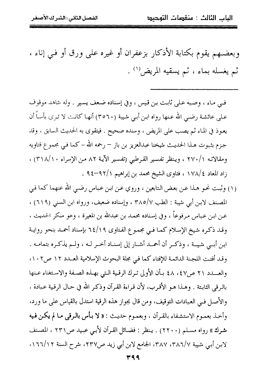 وبعضهم يقوم بكتابة الأذكار بزعفران أو غيره على ورق أو في إناء، ثم يغسله بماء، ثم يسقيه المريض"١".