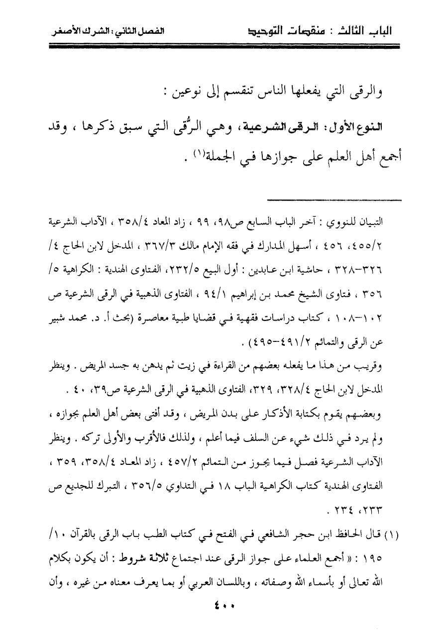 "١" قال الحافظ ابن حجر الشافعي في الفتح في كتاب الطب باب الرقى بالقرآن ١٠/١٩٥: "أجمع العلماء على جواز الرقى عند اجتماع ثلاثة شروط: أن يكون بكلام الله تعالى أو بأسماء الله وصفاته، وباللسان العربي أو بما يعرف معناه من غيره، وأن