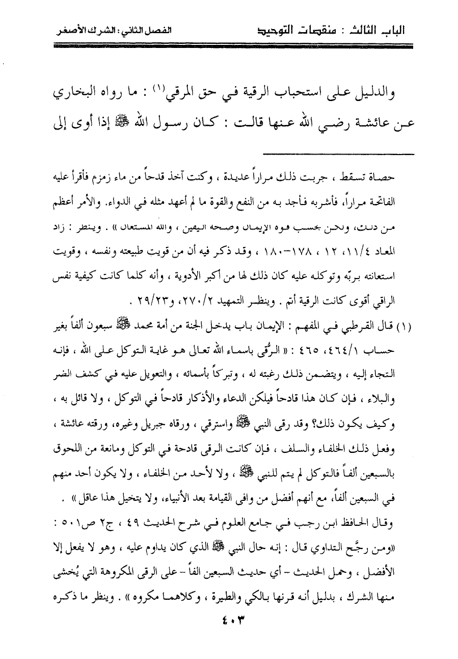 "١" قال القرطبي في المفهم: الإيمان باب يدخل الجنة من أمة محمد صلى الله عليه وسلم سبعون ألفاً بغير حساب ١/٤٦٤، ٤٦٥: "الرُّقى باسماء الله تعالى هو غاية التوكل على الله، فإنه التجاء إليه، ويتضمن ذلك رغبته له، وتبركاً بأسمائه، والتعويل عليه في كشف الضر والبلاء، فإن كان هذا قادحاً فيلكن الدعاء والأذكار قادحاً في التوكل، ولا قائل به، وكيف يكون ذلك؟ وقد رقى النبي صلى الله عليه وسلم واسترقي، ورقاه جبريل وغيره، ورقته عائشة، وفعل ذلك الخلفاء والسلف، فإن كانت الرقى قادحة في التوكل ومانعة من اللحوق بالسبعين ألفاً فالتوكل لم يتم للنبي صلى الله عليه وسلم، ولا لأحد من الخلفاء، ولا يكون أحد منهم في السبعين ألفاً، مع أنهم أفضل من وافى القيامة بعد الأنبياء، ولا يتخيل هذا عاقل".