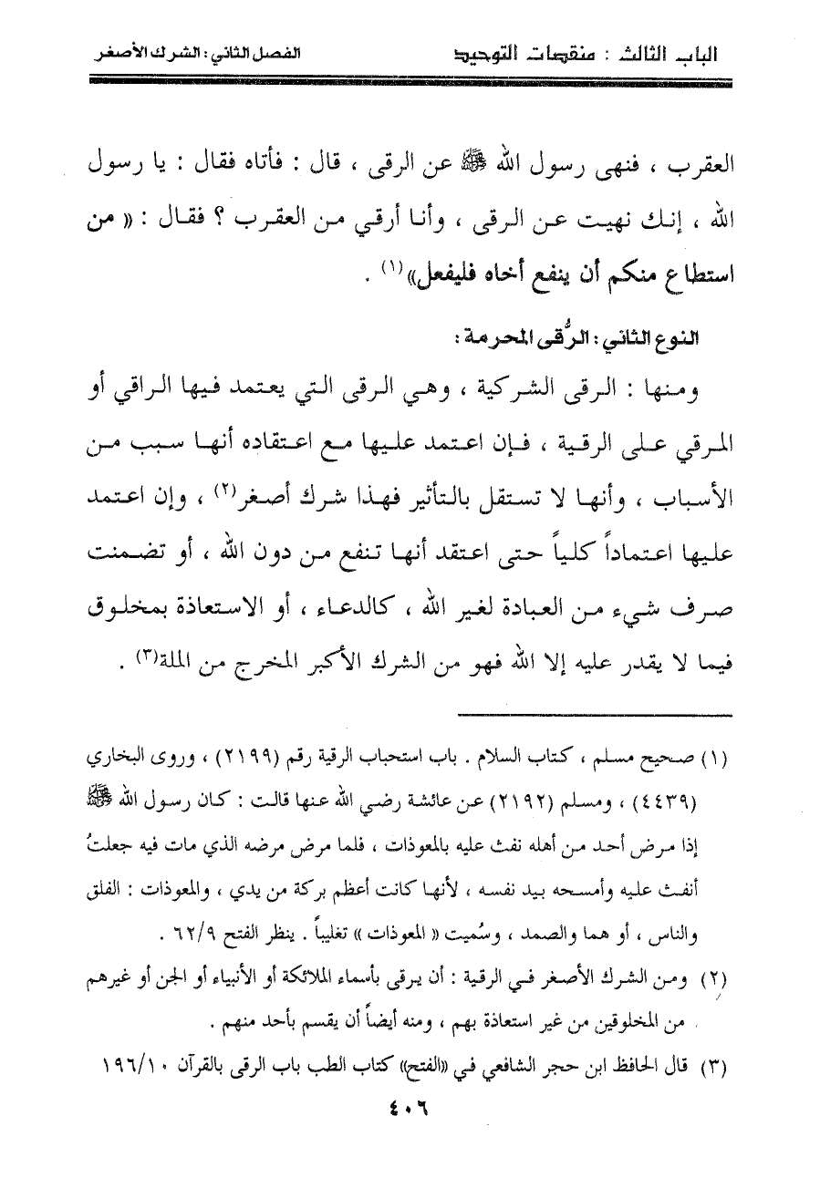 ومنها: الرقى الشركية، وهي الرقى التي يعتمد فيها الراقي أو المرقي على الرقية، فإن اعتمد عليها مع اعتقاده أنها سبب من الأسباب، وأنها لا تستقل بالتأثير فهذا شرك أصغر"٢"، وإن اعتمد عليها اعتماداً كلياً حتى اعتقد أنها تنفع من دون الله، أو تضمنت صرف شيء من العبادة لغير الله، كالدعاء، أو الاستعاذة بمخلوق فيما لا يقدر عليه إلا الله فهو من الشرك الأكبر المخرج من الملة"٣".