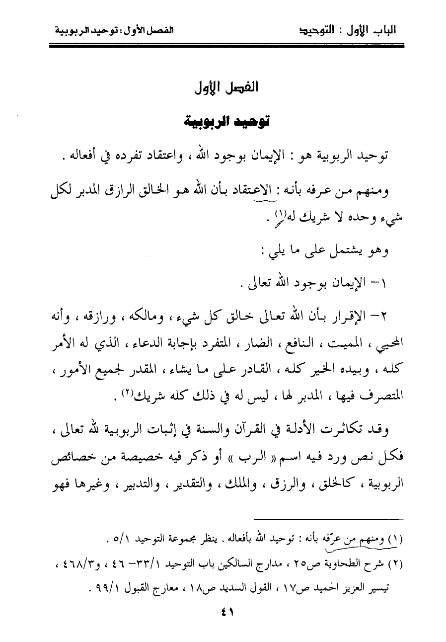 (٢) شرح الطحاوية ص٢٥، مدارج السالكين باب التوحيد ١/٣٣- ٤٦، و٣/٤٦٨، تيسير العزيز الحميد ص١٧، القول السديد ص١٨، معارج القبول ١/٩٩.